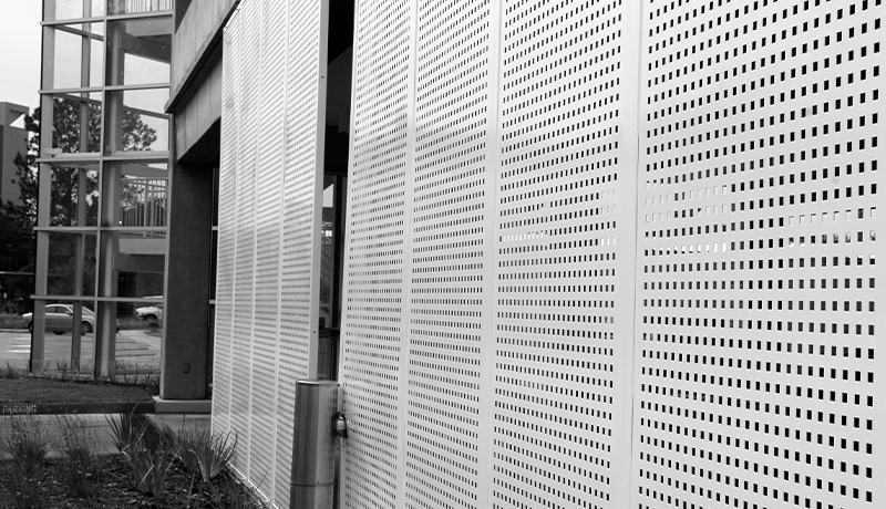 穿孔金屬闆廣泛用於外部陽光控制系統。
